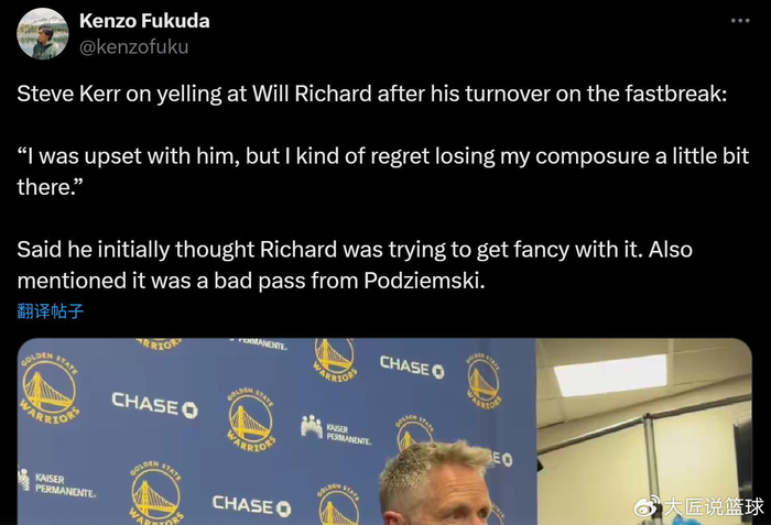 除此之外,科尔谈到了库里的伤病问题,透露库里在赛前进行了个人训练,自己认为他本赛季肯定会回归,但恢复时间不确定是一周、两周,还是更长的时间,因为他的状况有些棘手。